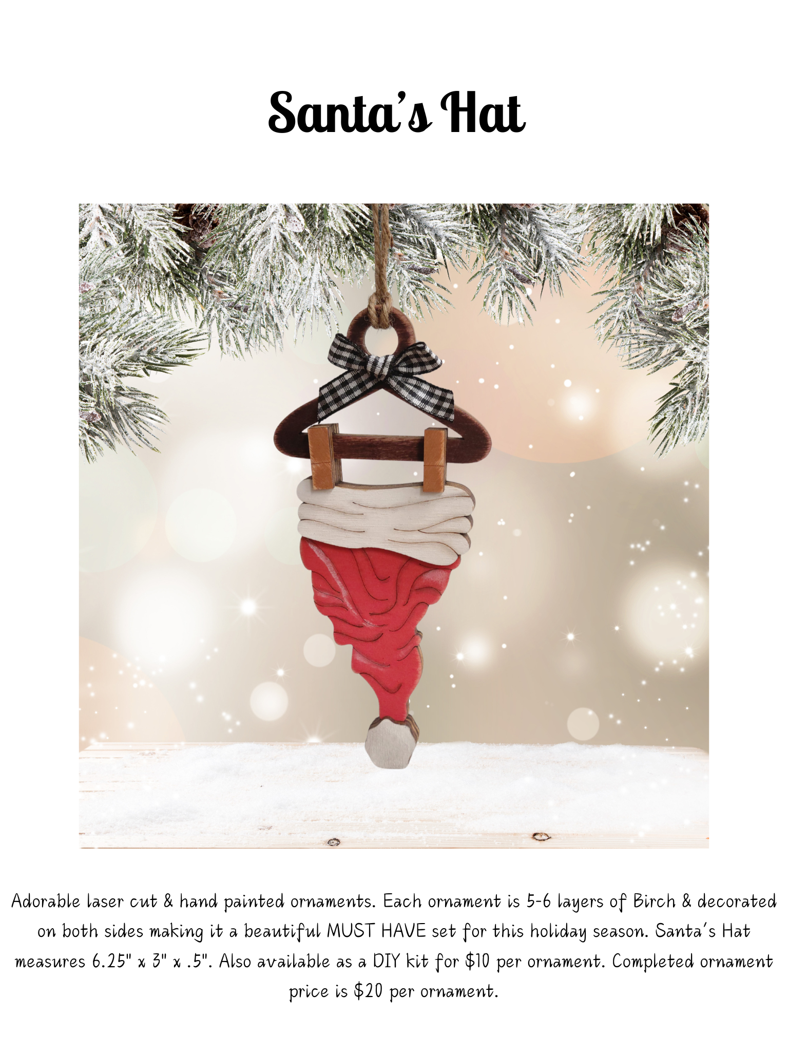 Adorable laser cut & hand painted ornaments. Each ornament is 5-6 layers of Birch & decorated on both sides making it a beautiful MUST HAVE set for this holiday season. Santa’s Hat measures 6.25" x 3" x .5". Also available as a DIY kit for $10 per ornament.